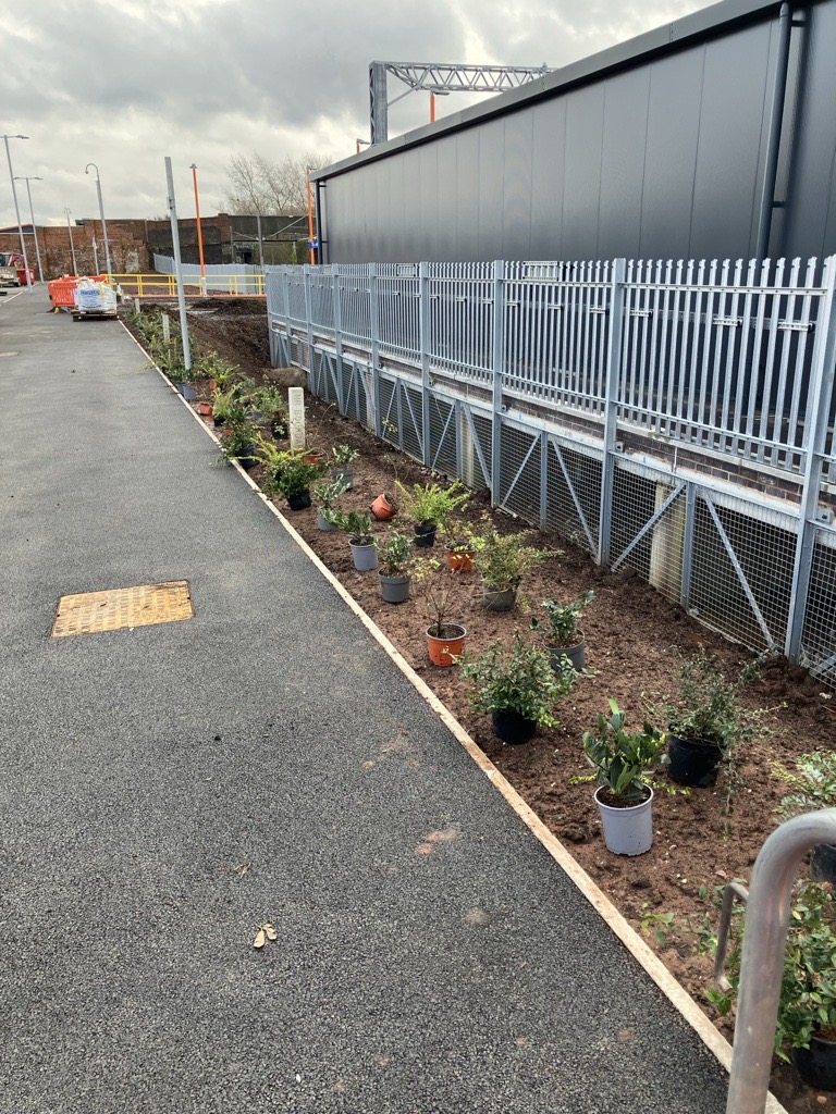 At Darlaston, the planting scheme is underway that will surround the commuter car park and station area. The current weather conditions will ensure they will be well watered in. The build includes the installation of a number of attenuation tanks to mitigate against flooding. On the approach to the station, Cemetery Road is also receiving some attention.